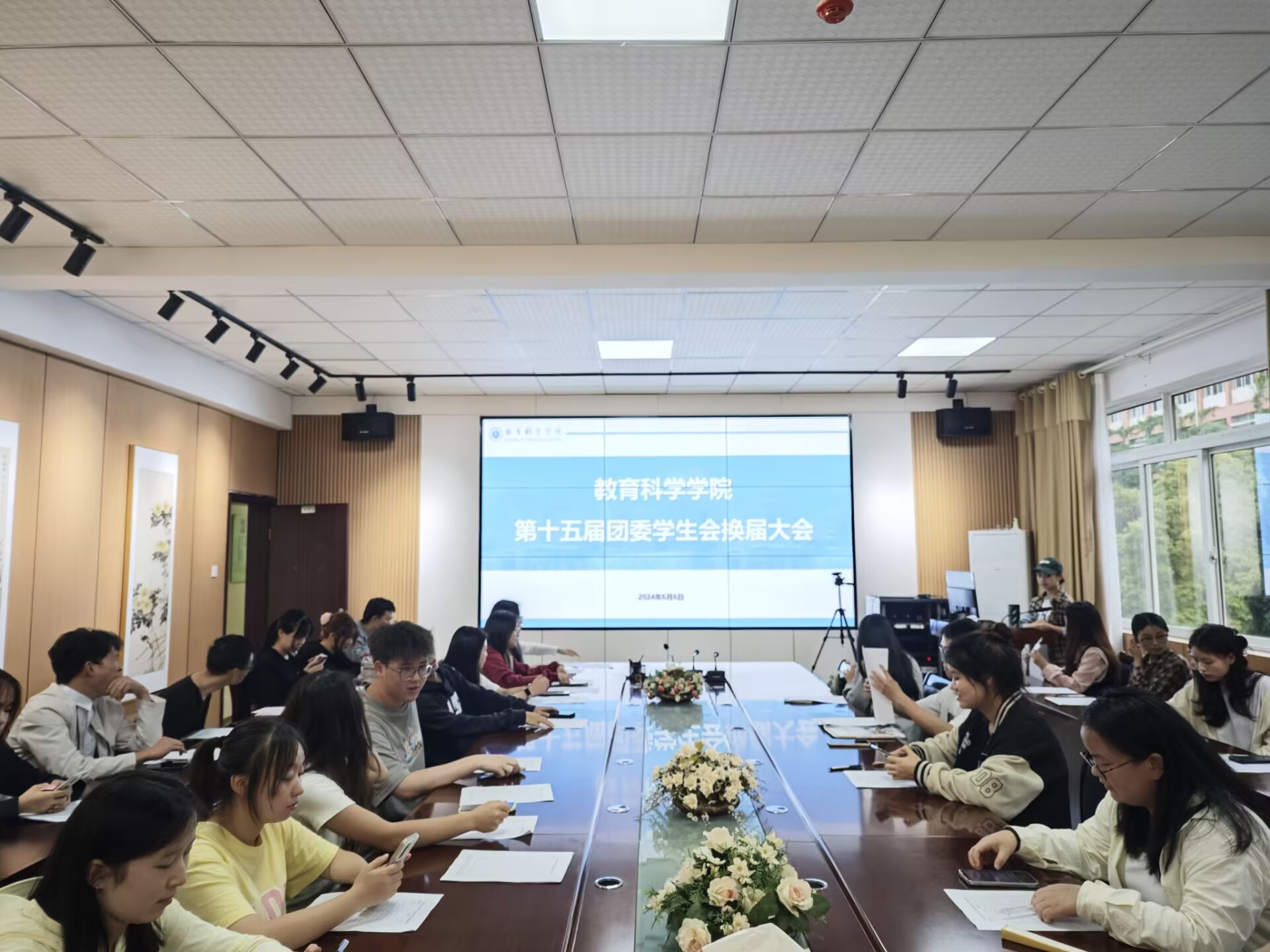 凝聚青春力量,砥砺使命担当。为加强校团委学生会组织建设,强化学生会成员的责任意识和担当精神,做好学生会承上启下工作,顺利完成新老学生会干部交替,2024年6月6日,教育科学学院学生会在逸夫楼会议室举行了换届大会,院团委书记张源、工会主席主懿芹,以及全体团委学生会成员,本次仪式由第十五届学生会主席杨诗韵主持。